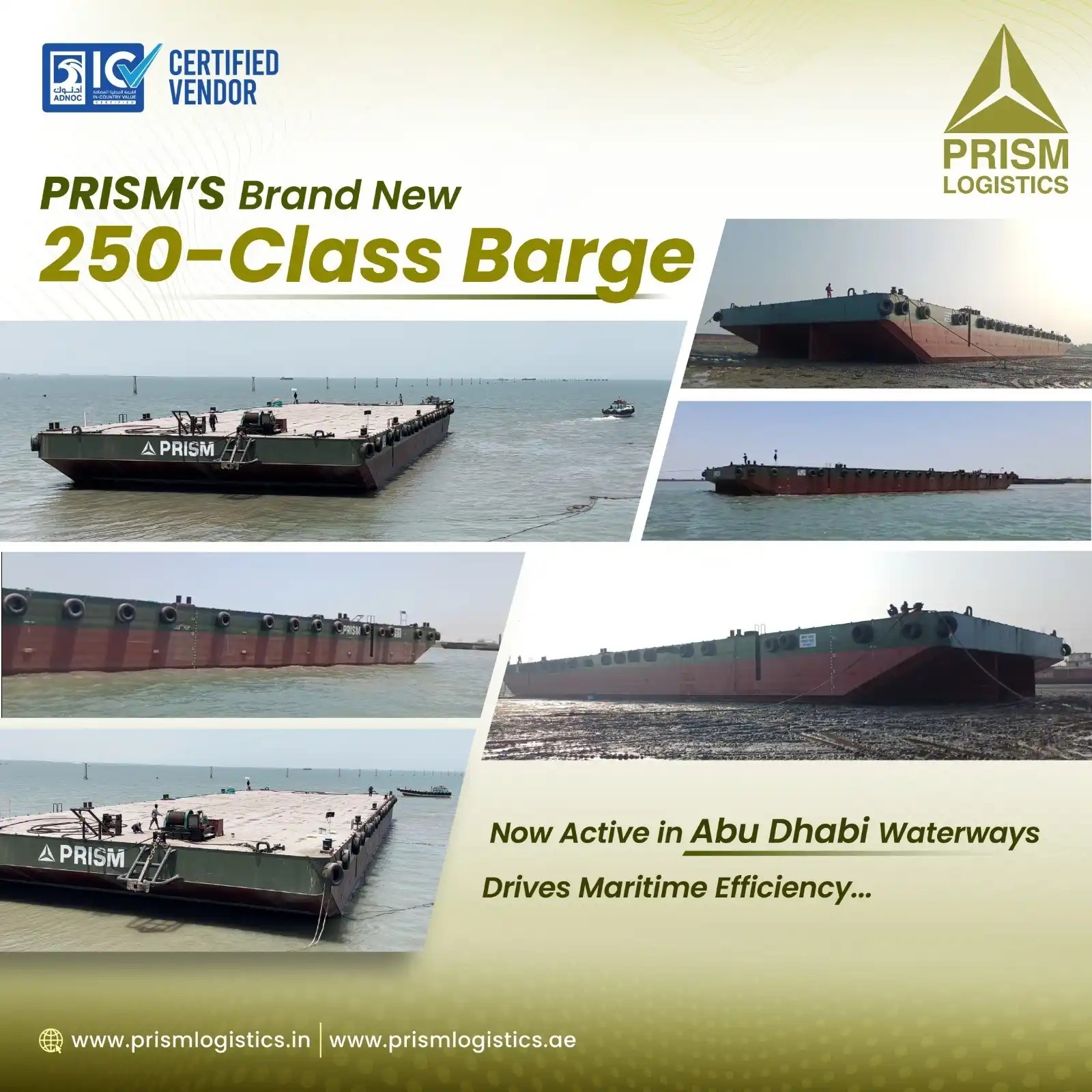 Prism Logistics adds a brand-new 250-class barge to its rich portfolio of assets. Now sailing in Abu Dhabi waters, this state-of-the-art barge further expands our capacity to seamlessly handle complex marine cargo projects with precision. Purpose-built to carry heavy loads across global sea routes, this latest addition pushes the boundaries of what's possible in maritime logistics. That’s not all—as three additional barges are in the pipeline, namely the 230-class barge, 300-class barge, and 330-class barges, ready to join operations in Abu Dhabi waters as well. As an ADNOC-certified vendor, fully compliant with ADNOC requirements, we continue to redefine maritime cargo movement in the GCC and beyond with top-notch engineering precision, and we are constantly working to come up with more innovative logistics solutions soon. Prism Logistics—Redefining Marine Logistics with State-of-the-Art Barging Solutions!